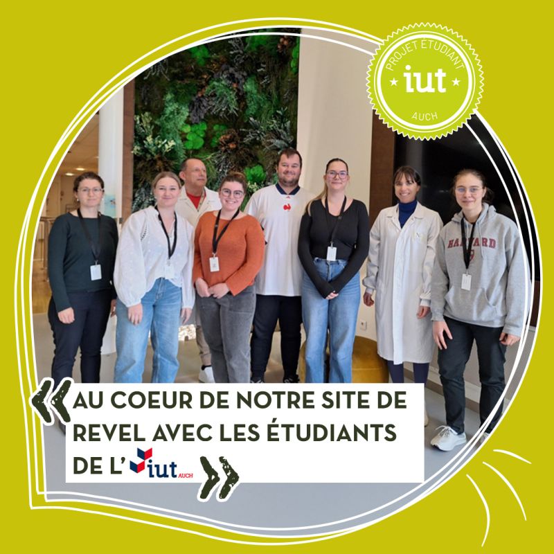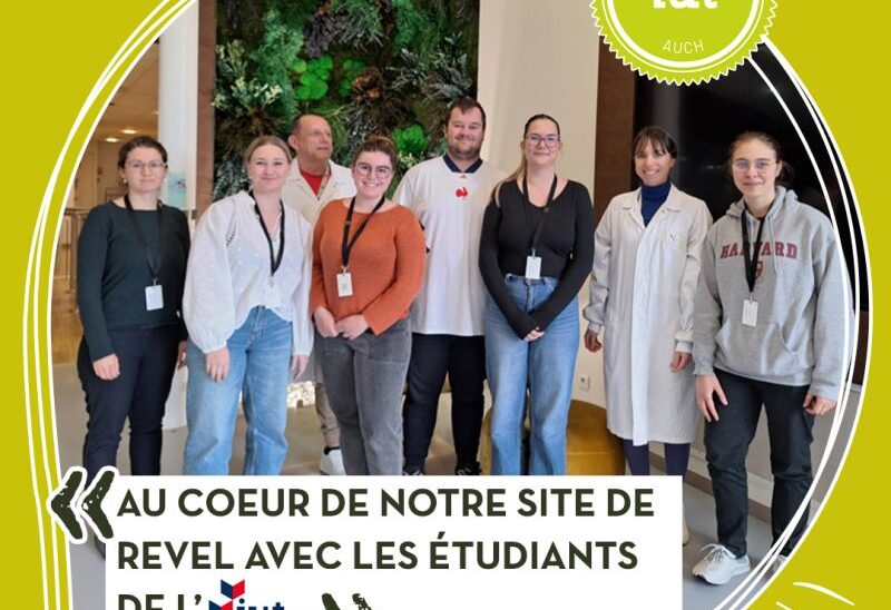 Le mois dernier, nous avons eu le plaisir d’accueillir sur notre site de Revel un groupe d’étudiants (Emeline, Mila, Enrique, Camille et Manon) de l’IUT d’Auch dans le cadre de leur projet de troisième année de BUT Génie Biologique – Sciences de l’Aliment et Biotechnologies.